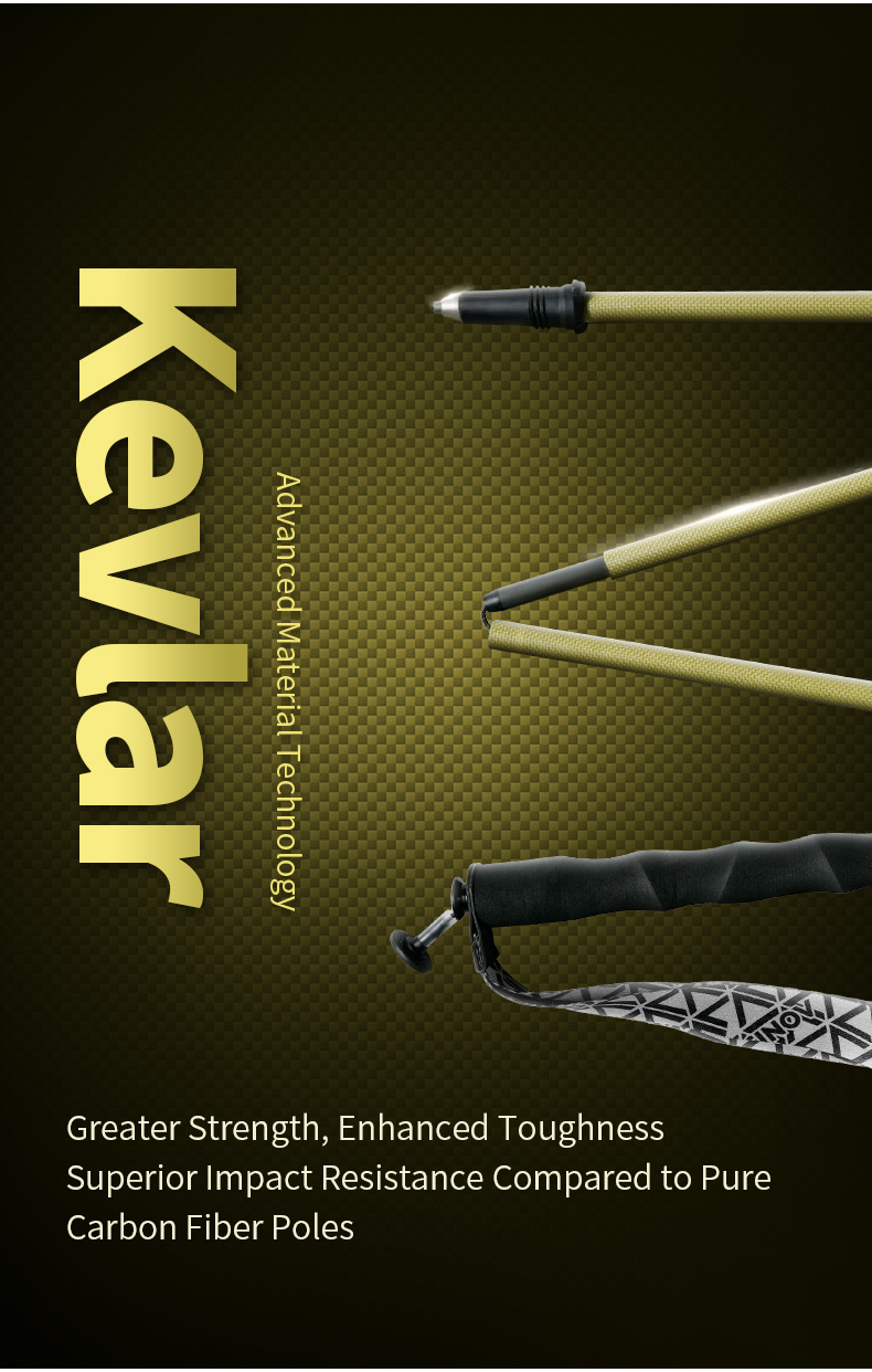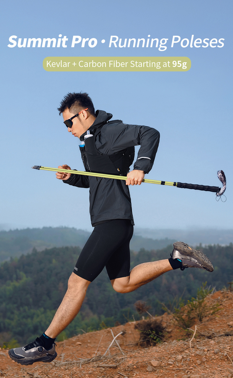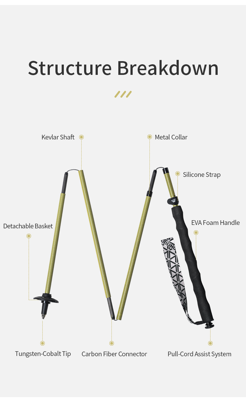 Este bastón de trekking presenta un diseño ultraligero de tan solo 95 g , lo que facilita su transporte con mínima carga. El mástil de Kevlar ofrece un equilibrio entre resistencia y estabilidad para un apoyo fiable. Incorpora un sistema de cordón de despliegue rápido de Dyneema que permite un montaje rápido con un simple tirón y un almacenamiento sencillo y sin enredos. El mango de EVA con correa de silicona proporciona un agarre cómodo y seguro. Equipado con una punta de acero de tungsteno-cobalto y una cesta para barro desmontable , se adapta fácilmente a diversos terrenos como senderos de tierra, caminos forestales y caminos de grava, ideal para trail running y senderismo.