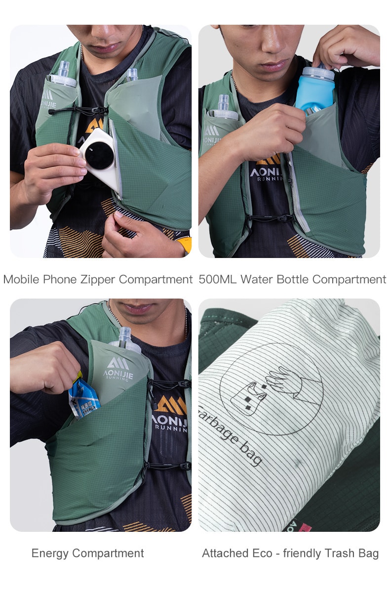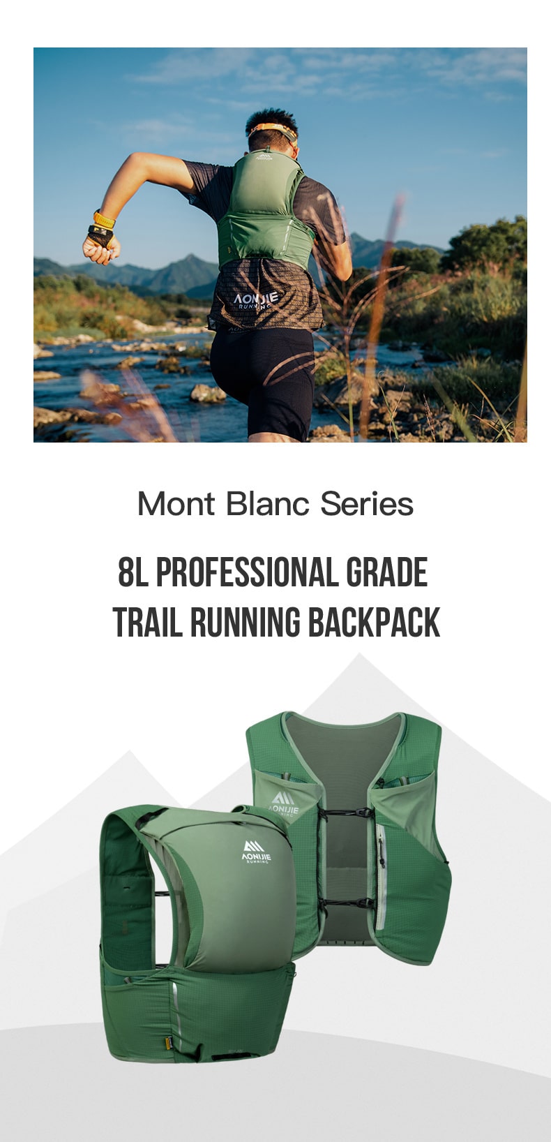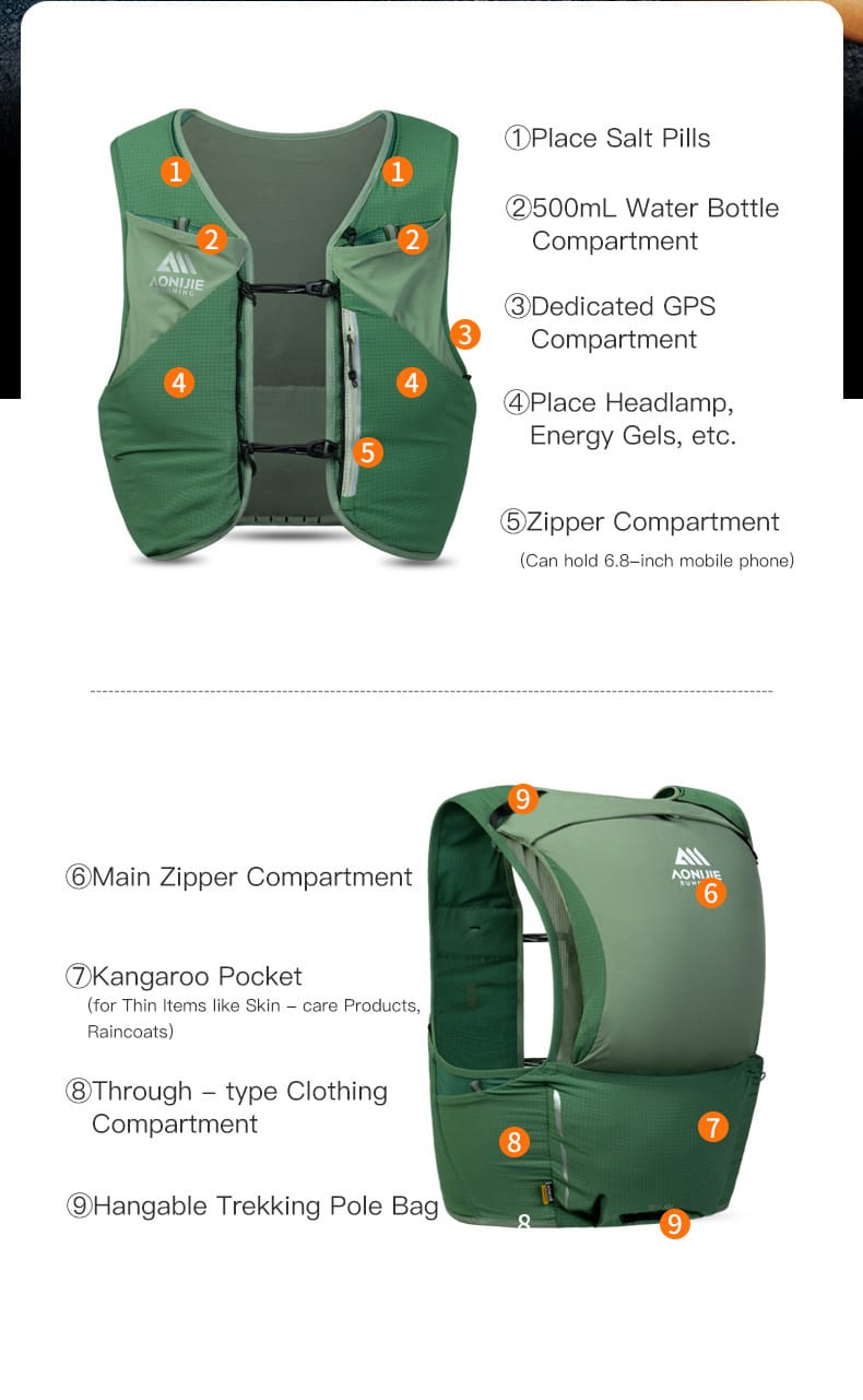 La mochila profesional de trail running Mont Blanc Series 8L es ligera (≈193 g para la talla M) y utiliza tecnología de ajuste dinámico para un uso estable. Cuenta con un almacenamiento científico multicompartimento: los compartimentos frontales albergan pastillas de sales, dos botellas de agua de 500 ml, un teléfono de 6,8 pulgadas y suministros de energía; los compartimentos traseros cuentan con puntos de montaje para bolsas de bastones, un compartimento principal con cremallera, un compartimento de almacenamiento, un compartimento para ropa de tipo pasante y admiten dos formas de montaje externo de bastones de trekking. Fabricada en malla a cuadros, malla transpirable con cremalleras YKK, es seca y duradera. Con detalles fáciles de usar como almacenamiento lateral de fácil acceso, compatibilidad con botellas de agua de 500 ml, un compartimento para teléfono con cremallera antipérdida, un compartimento para energía y una bolsa de basura ecológica gratuita, es ideal para trail running, montañismo, ciclismo, etc.,