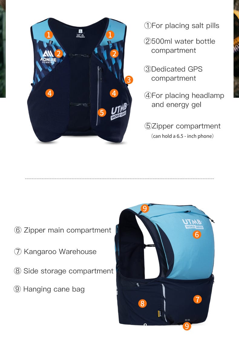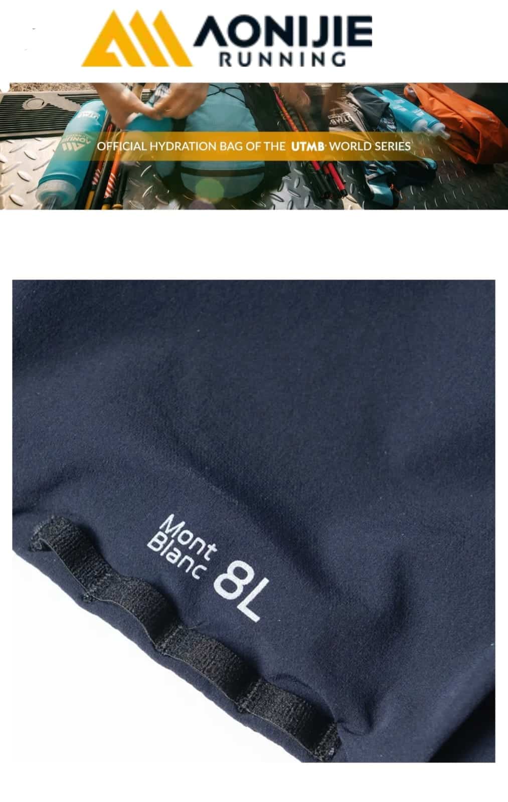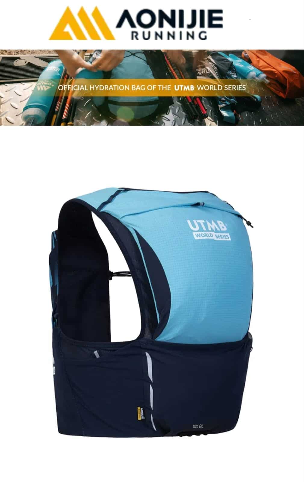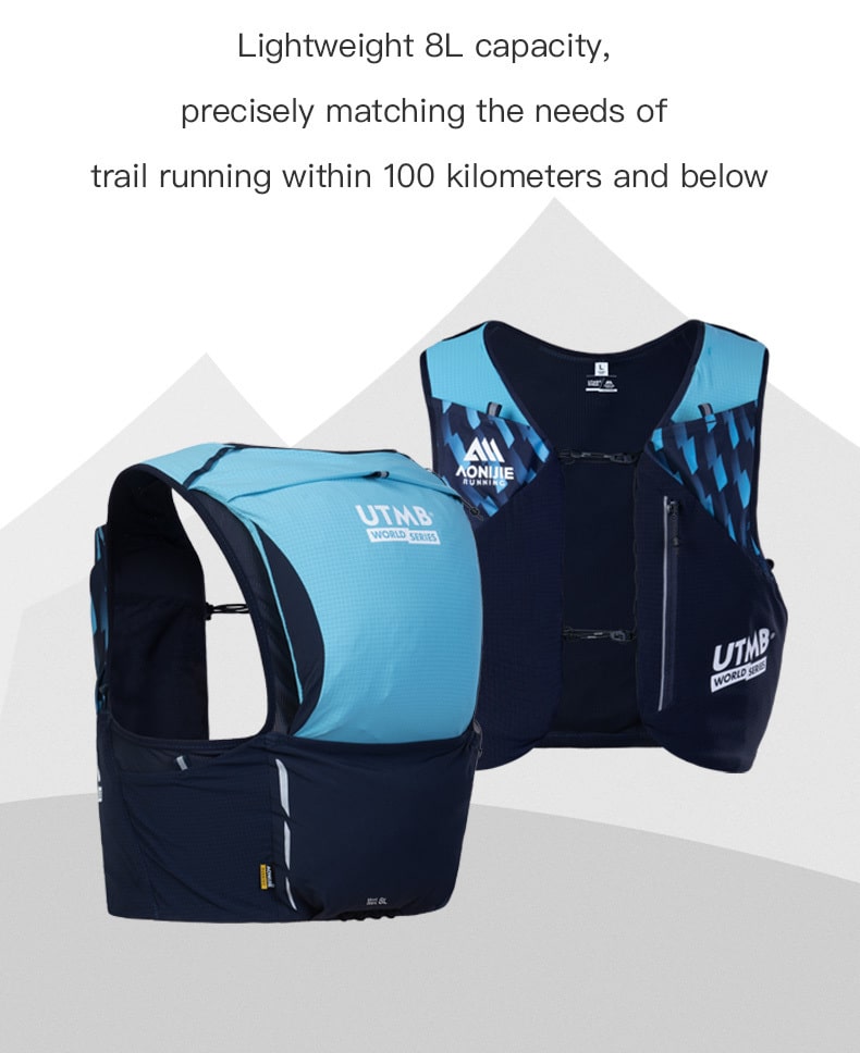 Esta mochila de trail AONIJIE Mont Blanc Series de 8 L, comarca oficial con UTMB, está inspirada en el Mont Blanc, el «Techo de Europa». Ligera (≈200 g), su capacidad de 8 L es ideal para carreras de trail de menos de 100 km.