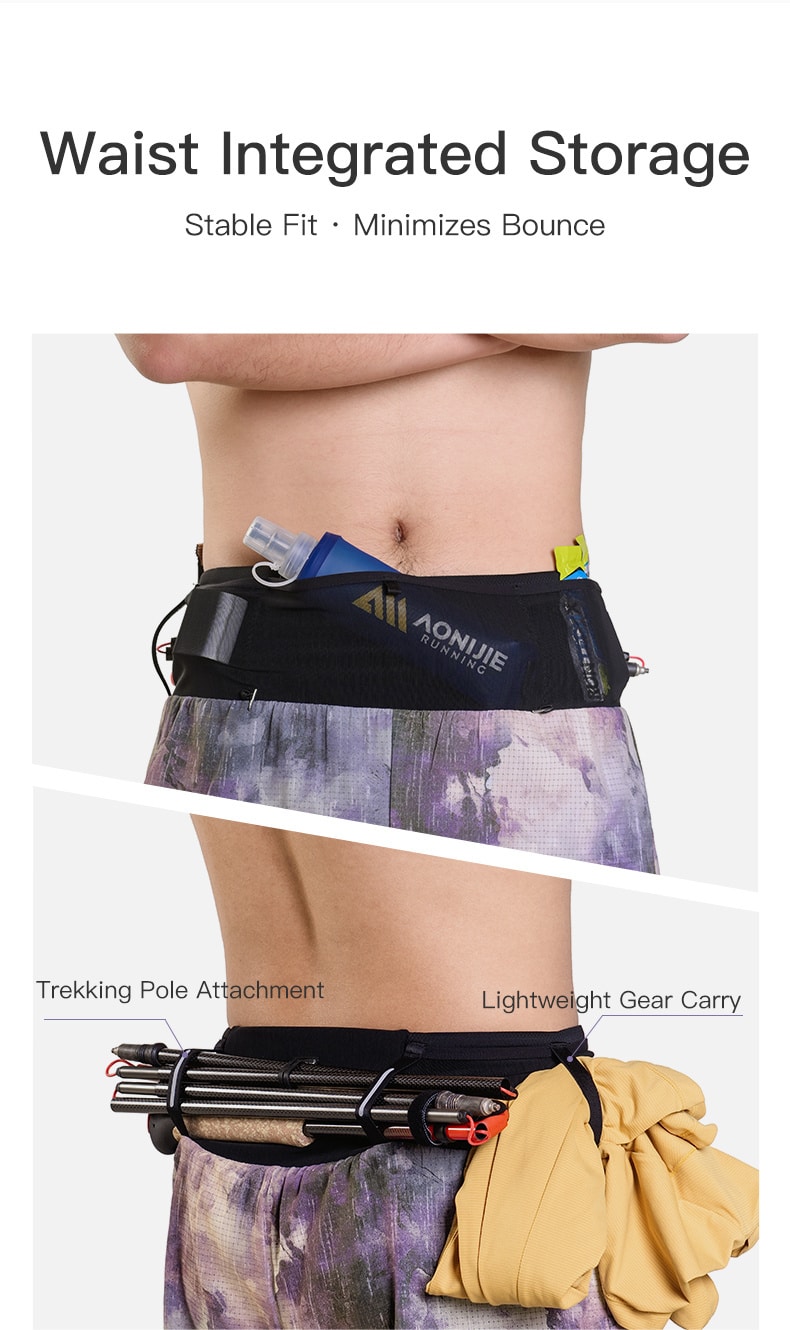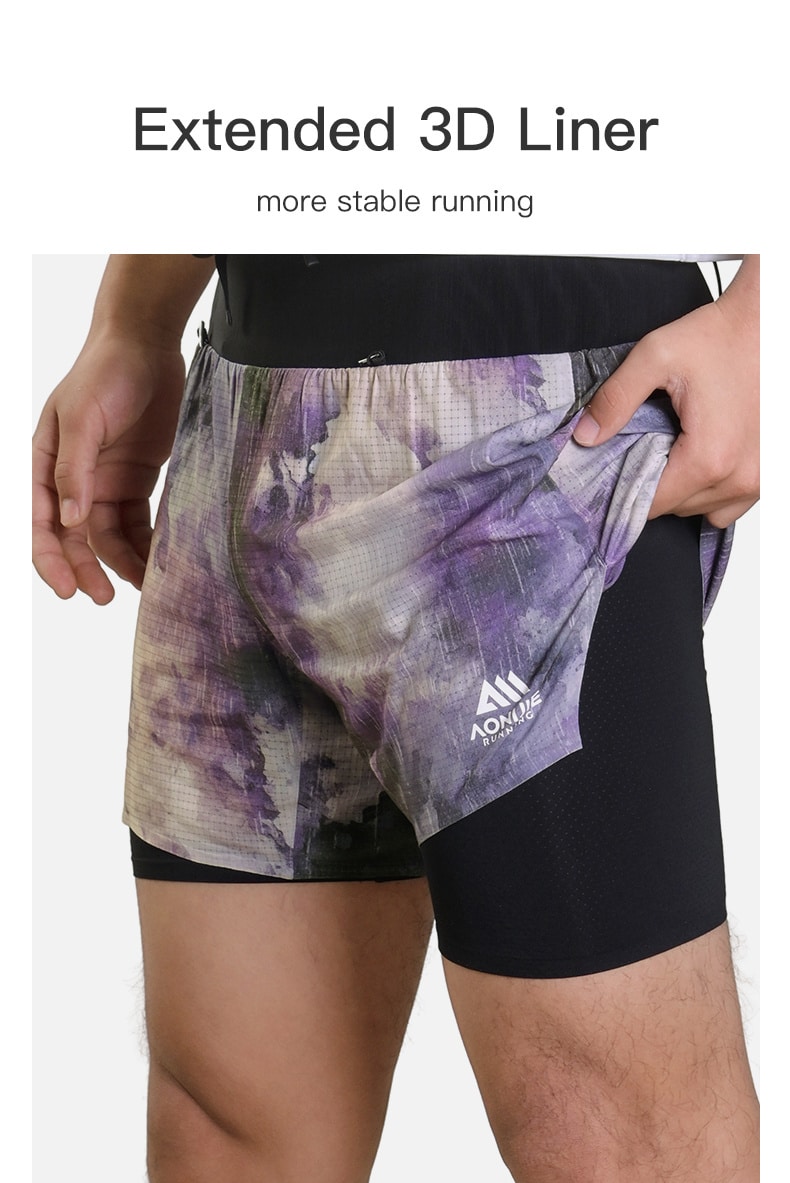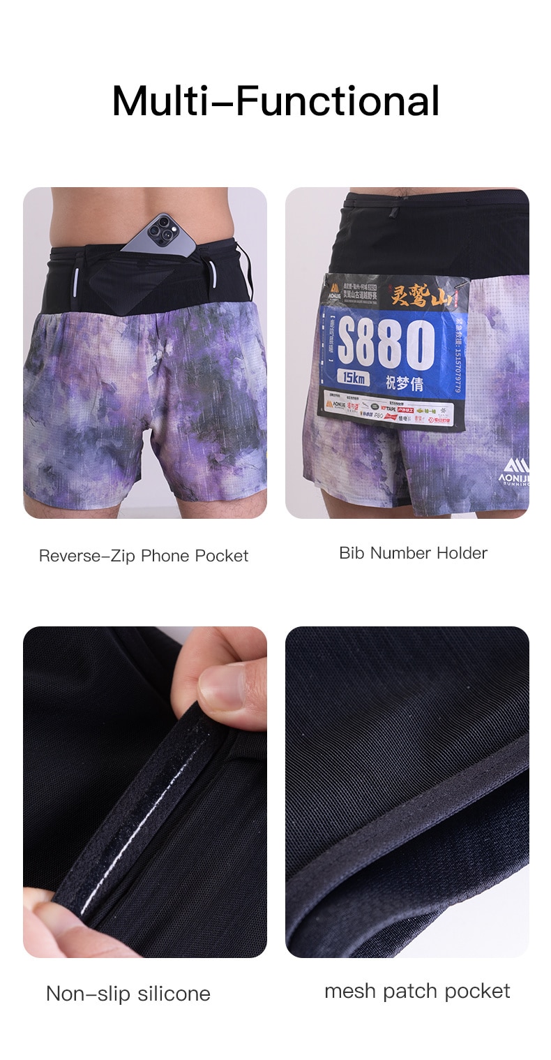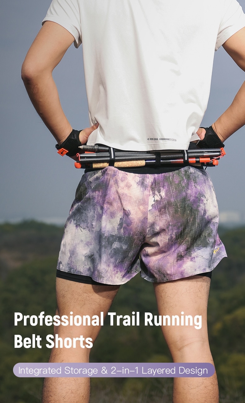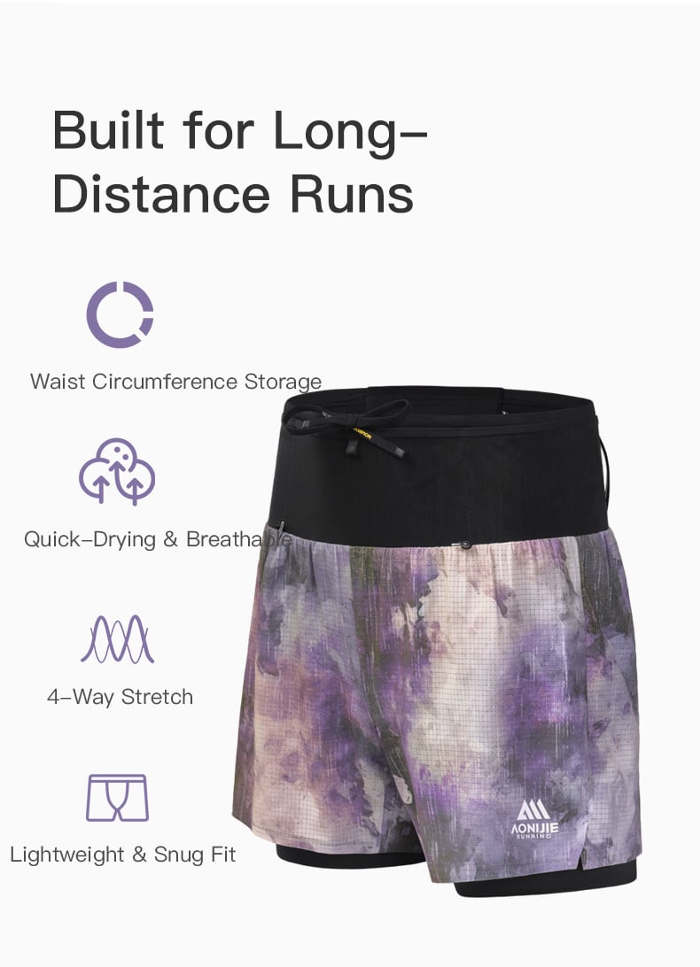 AONIJIE shorts Diseñados para carreras de trail de larga distancia, estos pantalones cortos tipo riñonera 2 en 1 incorporan un sistema de almacenamiento integrado en la cintura para llevar de forma estable y sin rebotes lo esencial, como agua, teléfono y equipo. La malla exterior y el forro interior ligero ofrecen transpirabilidad de secado rápido, mientras que el tejido elástico en cuatro direcciones garantiza una total libertad de movimiento. Con un forro interior extendido para mayor estabilidad y detalles prácticos como tiras reflectantes y trabillas para el dorsal, son la opción ideal para entrenamientos de trail y ultradistancia.