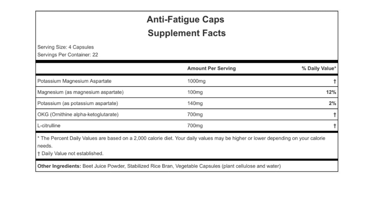 INFO ADICIONAL: DESGLOSE DE INGREDIENTES:Aspartato de potasio / magnesio: este compuesto está compuesto de potasio y magnesio quelados (también conocido como «unido») al aminoácido ácido aspártico. A menudo se usa para aliviar la fatiga general y, a veces, participa en regímenes de tratamiento para el síndrome de fatiga crónica.L-citrulina: este aminoácido se encuentra en alimentos como la sandía, la cebolla y el ajo. La L-citrulina ayuda a eliminar el amoníaco en los músculos y el hígado. Al igual que el ácido aspártico, es beneficioso para aliviar la fatiga. OKG (ornitina alfa-cetoglutarato): una combinación del aminoácido L-ornitina y el compuesto alfa-cetoglutarato. OKG proporciona una fuente de glutamina en el cuerpo que no produce amoníaco y está disponible fácilmente. Tanto la L-ornitina como el alfa-cetoglutarato actúan como eliminadores de amoníaco en el cuerpo. Polvo de jugo de remolacha: mientras que la función principal de este ingrediente es colorear las cápsulas para diferenciarlas fácilmente de las cápsulas de apariencia similar como los endurolitos, el polvo de remolacha también aumenta los niveles de óxido nítrico.