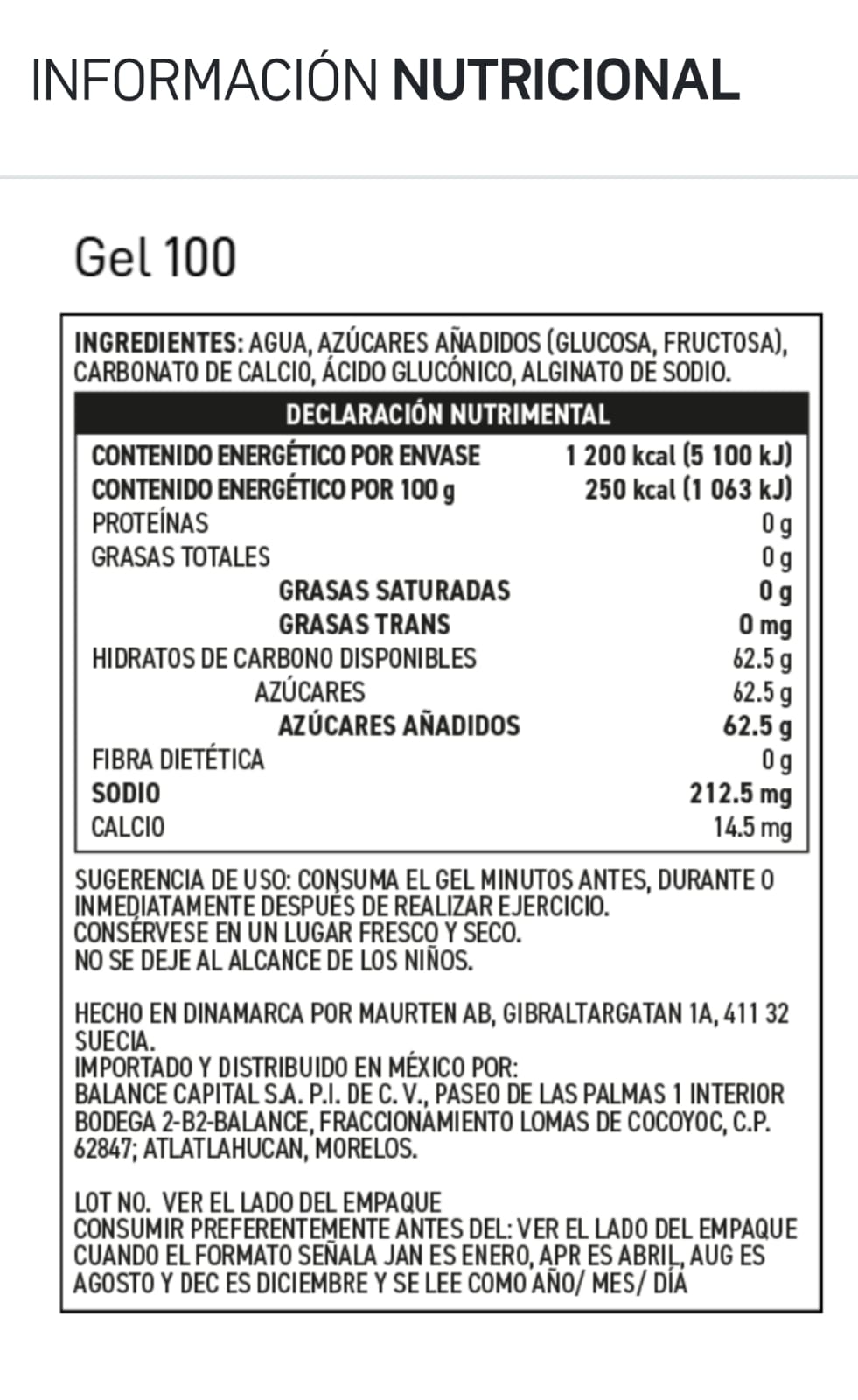 El Gel 100 es una matriz de biopolímero rellena de una mezcla de fructosa y glucosa (proporción de 0.8 : 1). Al emplear la tecnología de hidrogel, los carbohidratos que contiene el Gel 100 pueden pasar del estómago al intestino, donde el cuerpo los absorbe de manera más efectiva.