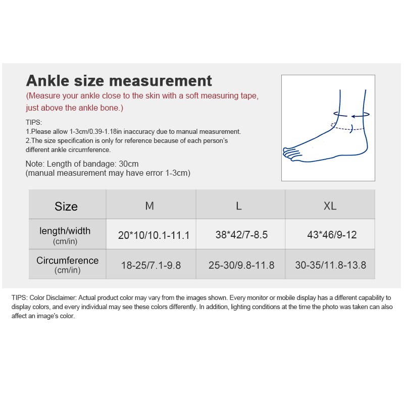 1. Mida la circunferencia del tobillo para elegir la talla de tobillera más adecuada. Gracias. La talla puede ser un poco más grande de lo habitual; si desea mayor compresión, pruebe una talla más pequeña.