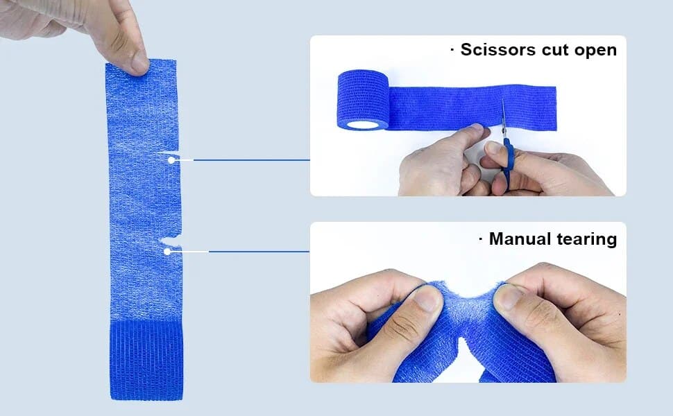 -Envoltura de vendaje autoadherente: la envoltura de vendaje es una cinta fuerte autoadherente que ofrece un excelente soporte, a diferencia de los vendajes no adhesivos, la envoltura de vendaje autoadhesiva no requiere clips ni alfileres.